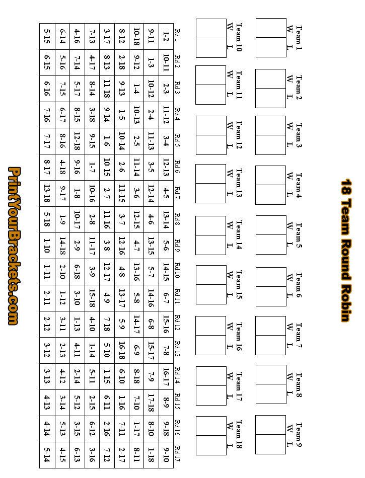 18 Team Round Robin Schedule; PRINTABLE BRACKETS. Single Elimination Brackets. Double Elimination Brackets. Game Brackets. Round Robin Schedule. POPULAR TEAM BRACKETS. 4 Team Bracket. 5 Team Bracket. 6 Team Bracket. 7 Team Bracket. 8 Team Bracket. 9 Team Bracket. 10 Team Bracket. 11 Team Bracket. 12 Team Bracket.