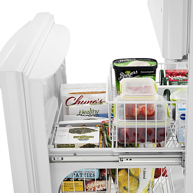 Le réfrigérateur à congélateur inférieur Amana® de 18,5 pi³, est doté de portes reversible et dispose de différentes options de rangement. Le réfrigérateur est muni de deux bacs à légumes GardenFresh(mc) à humidité contrôlée, de balconnets de porte pour contenants de 4 litres et deux tablettes pleine largeur, en verre.